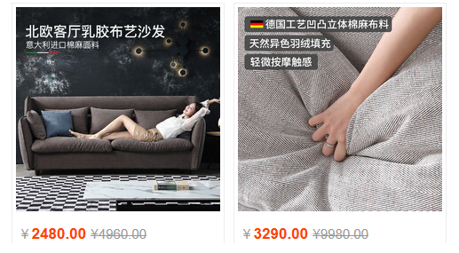 2、差异化,发布与其他人不一样的图片:大多商家的沙发图是全貌,而第二家主图是沙发面料,着重强调了面料的优势,让人想要知道这么好面料的沙发长什么样子。
