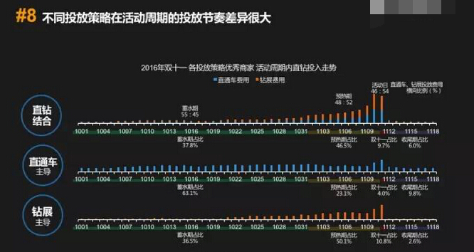直钻结合的商家在10月份的蓄水期,直通车的投放比例大于钻展,从11月1日起投放进入了爆发期,而且钻展的投放比例超过了直通车,尽管钻展的可评价性比较低,但商家还是加大在钻展方面的投入,以吸引更多流量进入店铺。