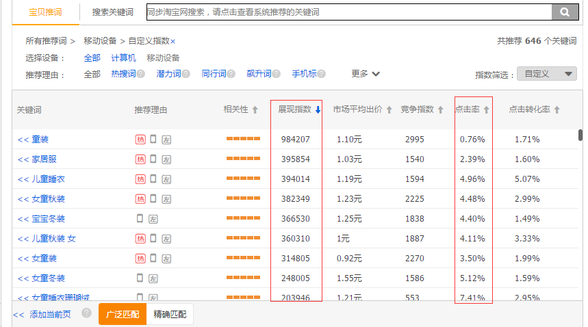 第二步:在确定款式有潜力,图片点击没问题的情况下,重新筛选关键词,需要展现量非常大,且点击率好的词10个左右(展现量大是为了后续人群测试,点击率好是为了能保证出高价就会有点击),选好词之后,所有的词无线端都出价卡到4-6位,PC端可以不管,愿意花钱的掌柜可以卡到前三,这样点击率更好,同时计划的日 限额提到500元一天。这个阶段只要点击率和加购,不看产出。