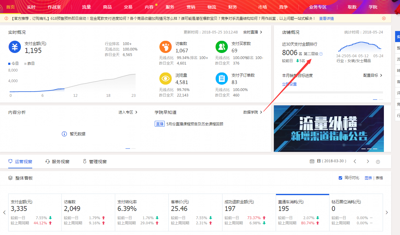 层级排名位,顾名思义,你在当前层级下是排名多少位。什么是层级?可能有些同学不知道。也不知道在哪里观察。其实这个端口在 卖家中心—生意参谋-店铺概况。如下图