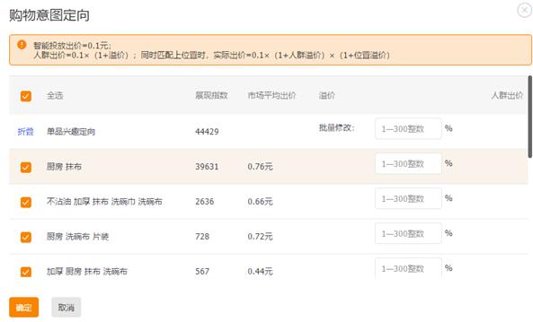 在进行人群设置的时候建议把系统推荐的人群都加上,后期根据数据的表现再慢慢优化就可以了。关于溢价的话前期建议30%左右就可以了,然后也是根据数据的反馈来慢慢优化。因为淘宝直通车位置的算法都是根据出价的高低来的,而且扣费也是根据下一家的出价来计算的,所以想更快的获取流量和推广费也是很充足的话,就可以出高价来得到考前的排名。