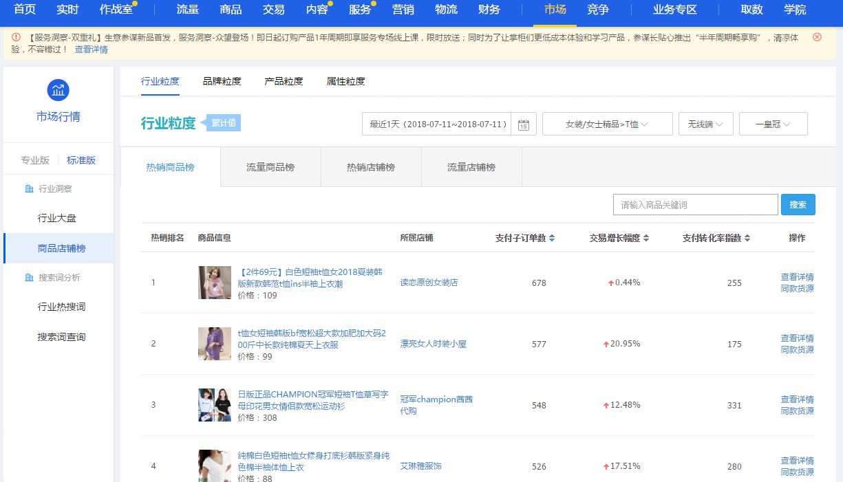 1.工具选款:工具选款主要是选同行的款,通过市场行情-商品店铺榜,在进行选款的时候我们需要精准类目,类似等级,店铺的主要来源以手淘搜索为主,算同行的高转化词,通过高转化词进行选款。